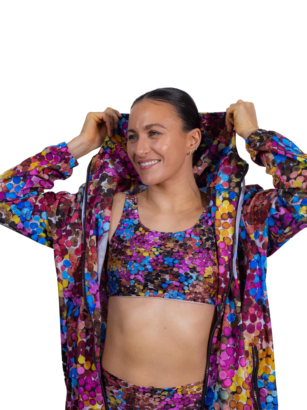 Top dupla face em poliamida com elastano, toque macio e delicado. Sua modelagem garante liberdade de movimento e sustentação, proporcionando segurança. Testado em diferentes biotipos, adapta-se a várias proporções de busto e costas. O decote frontal é intermediário, equilibrando conforto e proteção. As cavas são mais amplas, sem apertar as axilas. O elástico embutido nas costuras assegura perfeita aderência ao corpo. Um lado é estampado e o outro liso, oferecendo versatilidade.
