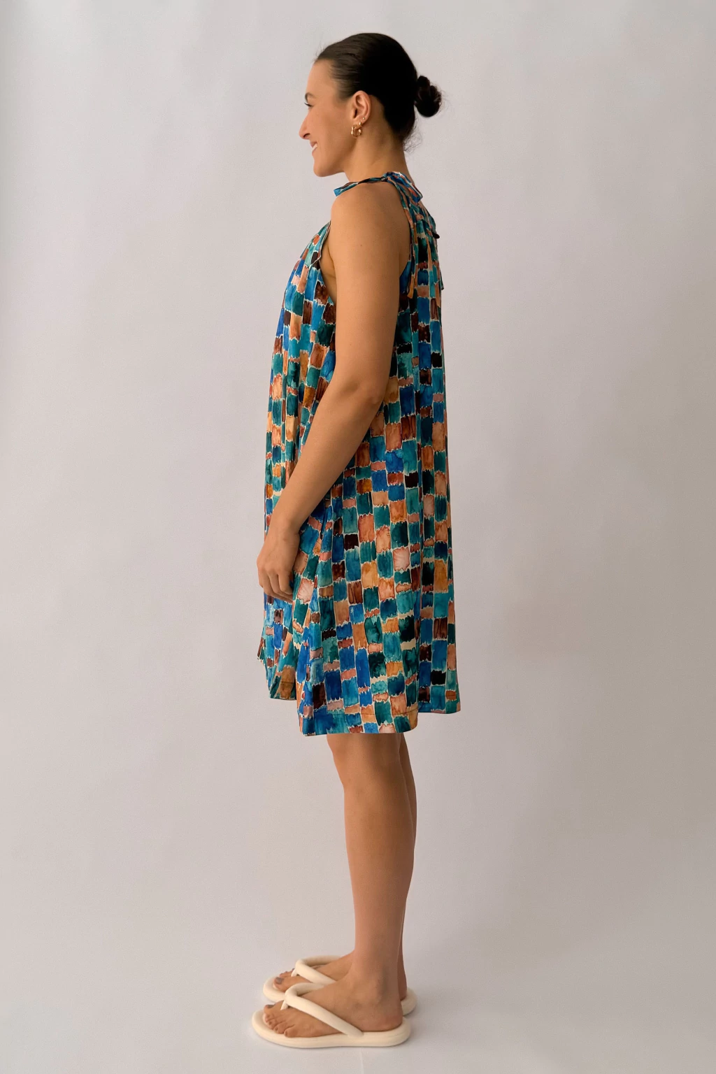 Vestido curto e amplo, feito em viscose leve, bem fresquinho, ideal para os dias bem quentes. Bolsos embutidos nas laterais para mais praticidade no dia a dia. Possui alças com amarrações nos ombros para ajustar a altura do decote e o comprimento. Forro na altura do busto, para as costuras da cava e decote ficarem embutidos. O acabamento da barra é largo.
